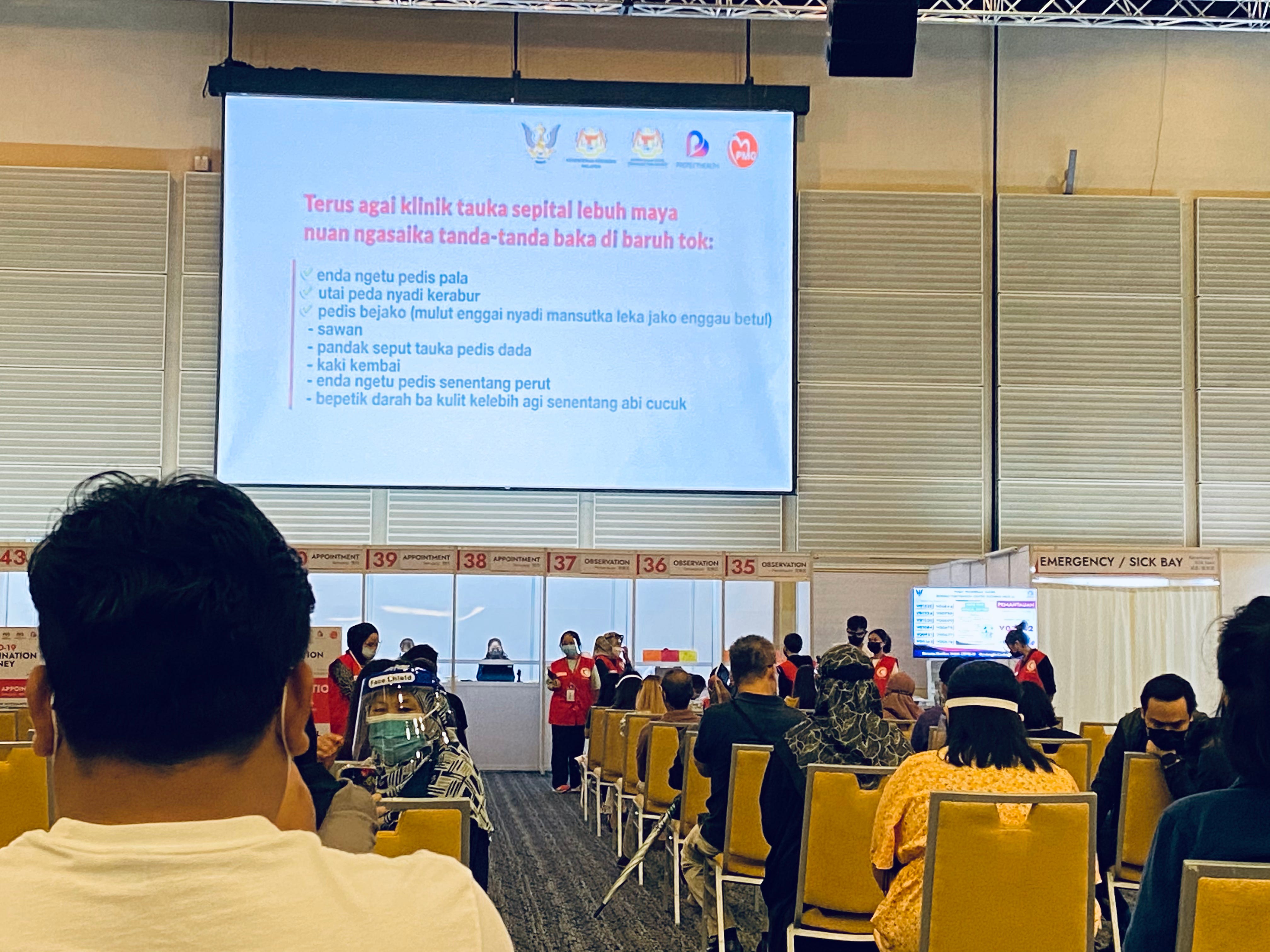 PSA videos of front liners on the verge of burnt out and projected post-jab instructions in Iban1 language